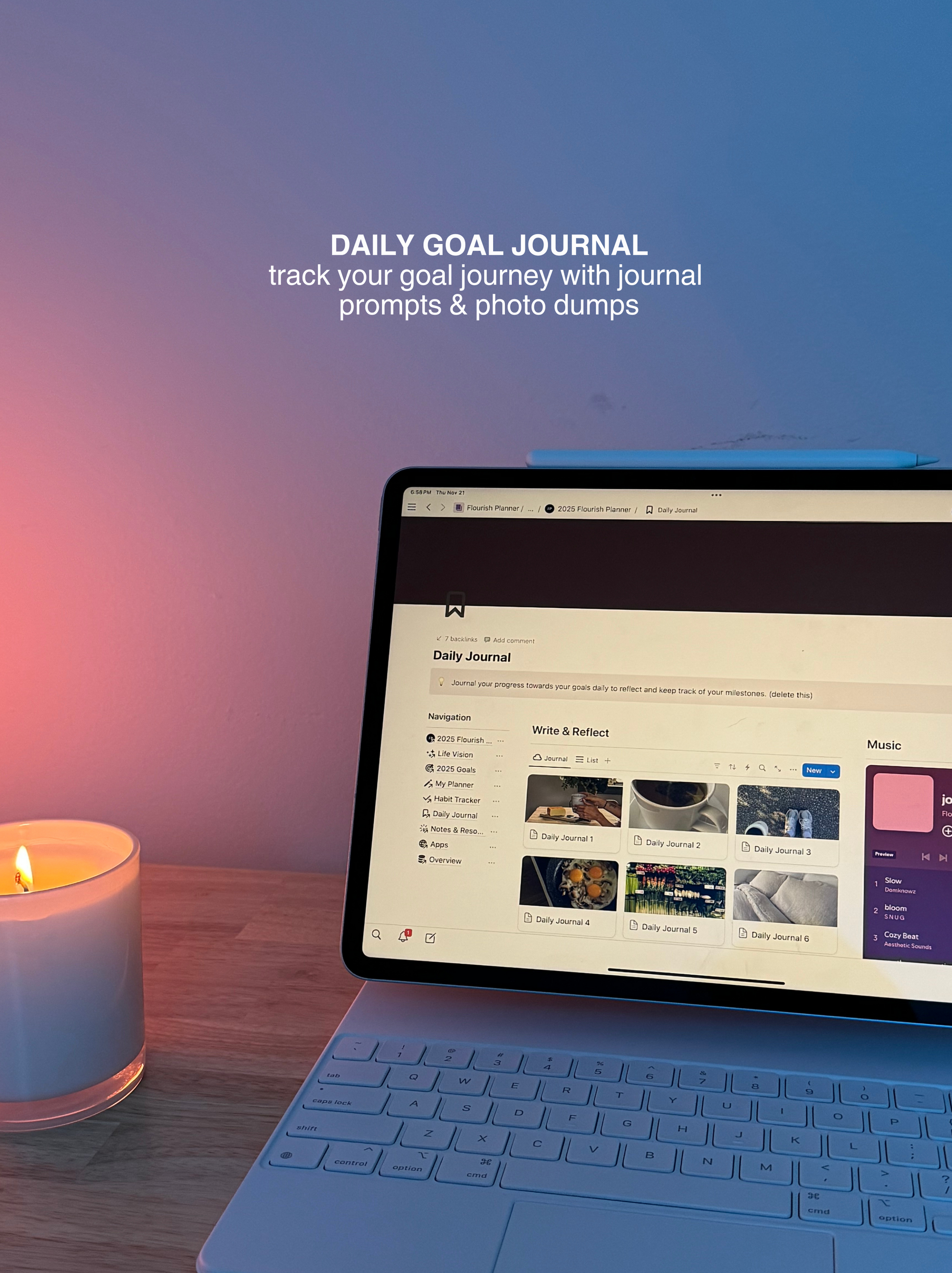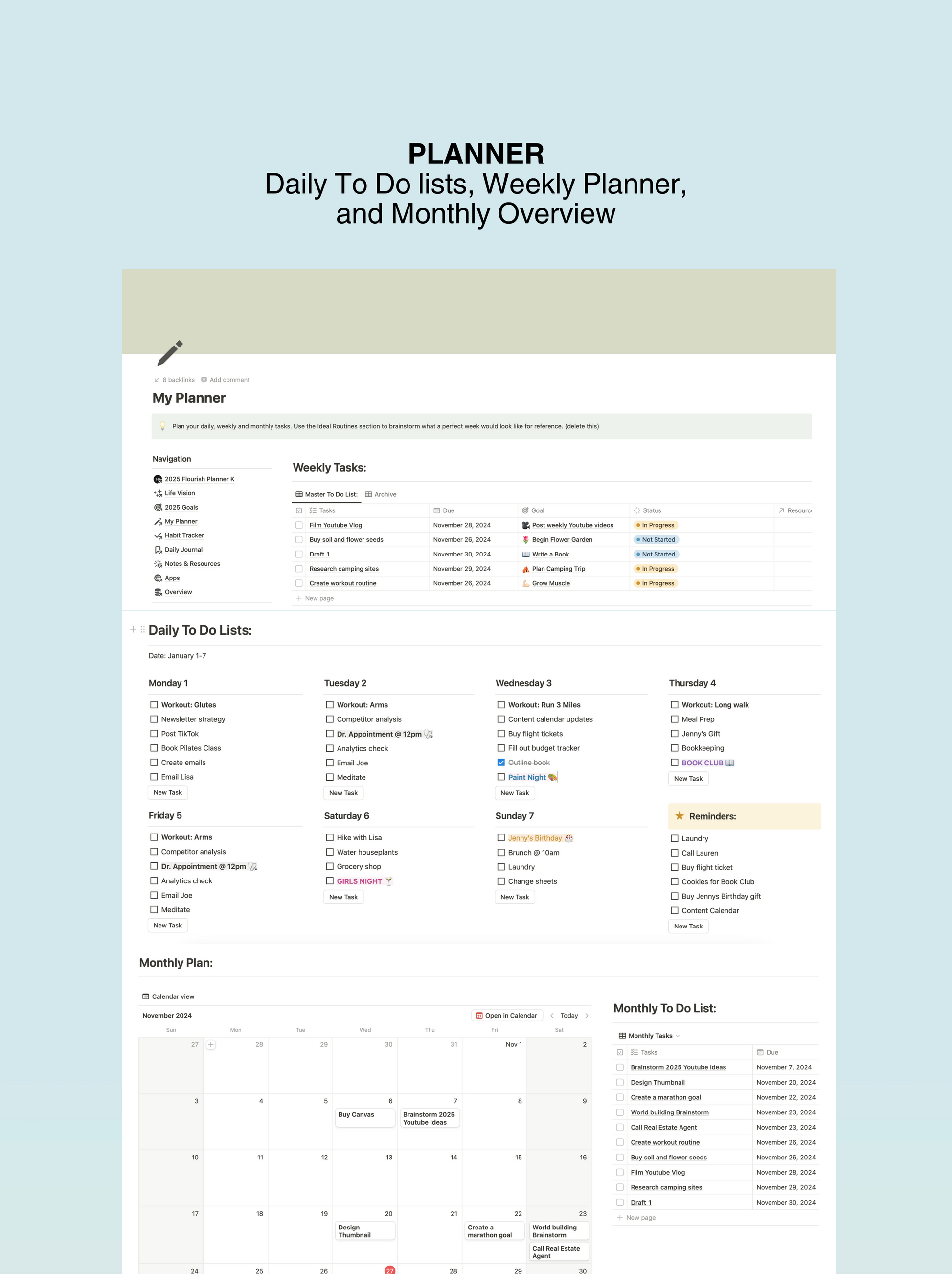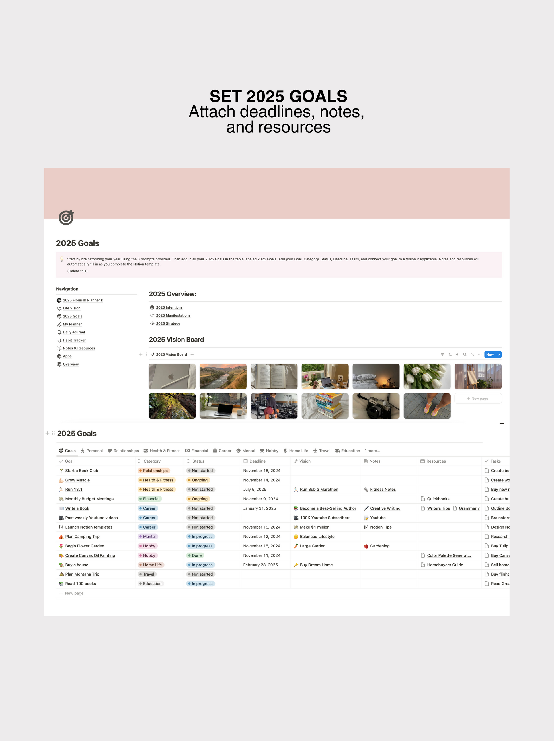 Achieve your goals in 2025 with this fully customizable Notion Planner, designed to help you set, track, and accomplish your biggest ambitions while keeping your daily life organized. Perfect for goal setters, productivity enthusiasts, and anyone ready to make 2025 their most organized year yet.
