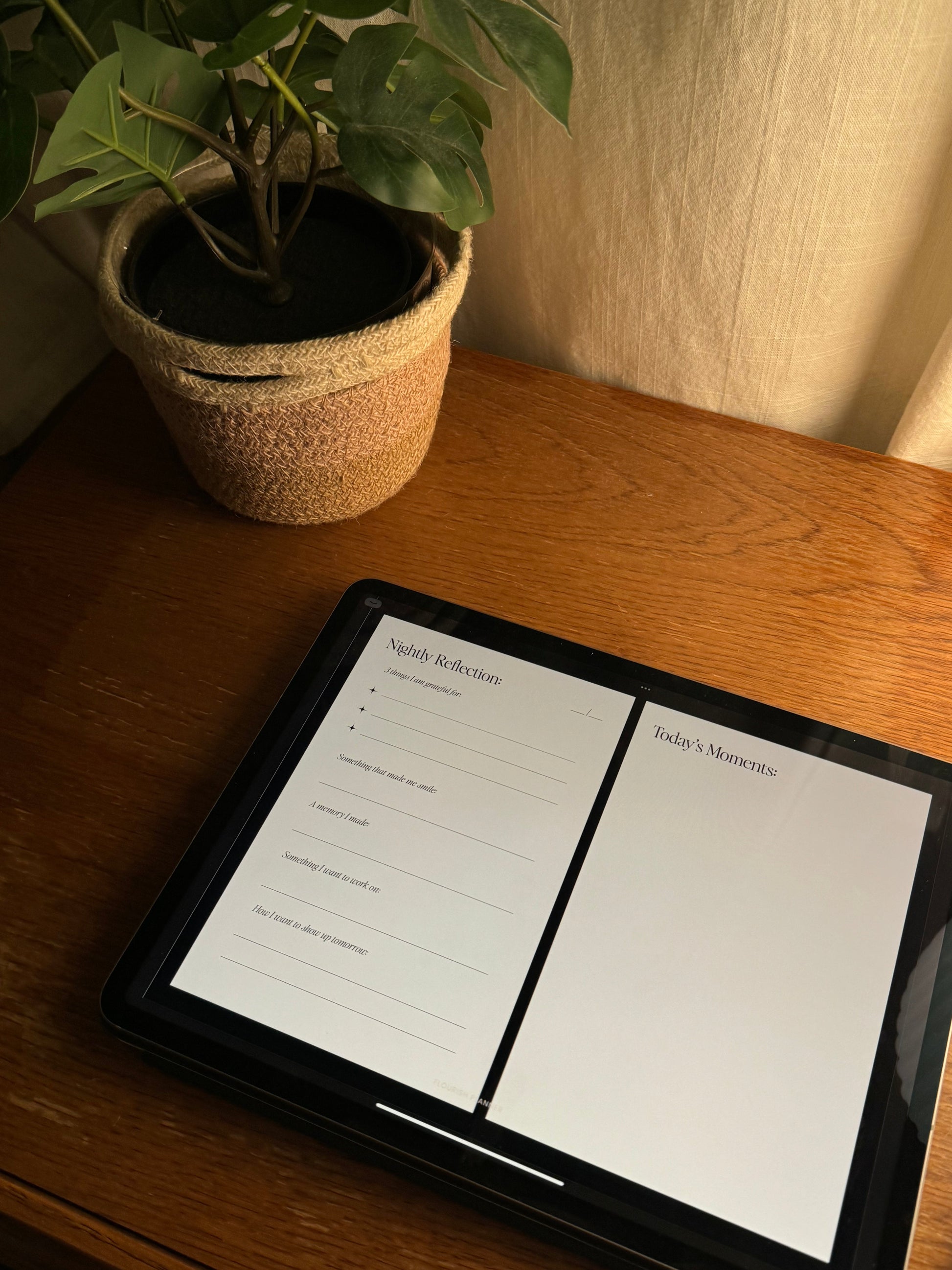 Use during your nightly routine to clear your mind and focus on gratitude. Works perfectly with apps like Goodnotes, Notability, or can be printed for pen-and-paper journaling.